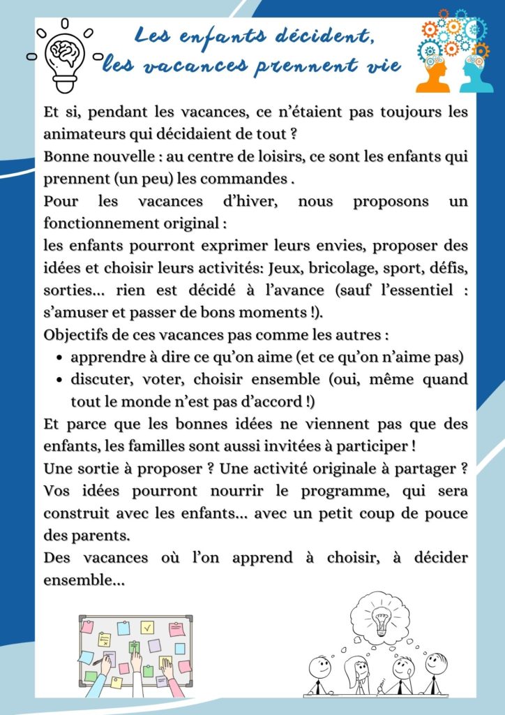 Durant ces vacances d’hiver, les enfants seront pleinement acteurs puisqu’ils choisiront leur programme d’activités. Dans le cadre de ce projet, nous souhaitons également associer les familles à la préparation des vacances.
