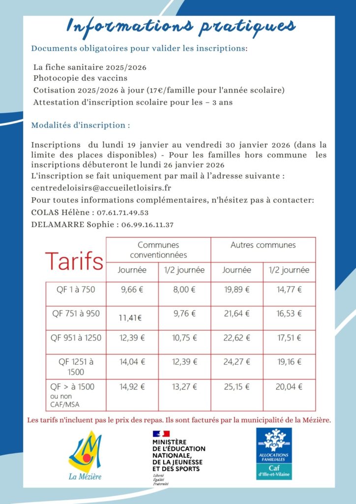 Les inscriptions pour les vacances d’hiver auront lieu du lundi 19 janvier au vendredi 30 janvier.